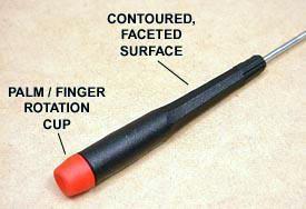 All Wiha™ handles are molded from durable, high impact black cellulose acetate and their contoured design provides smooth faceted surfaces (rather than a rough knurled finish) for a very comfortable fit to the hand. Each handle is also fitted with a smooth turning palm/finger rotation cup.