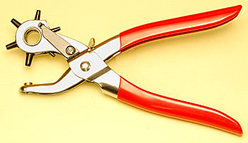 Handy punch pliers features rotating head and 6 different hole punch sizes.